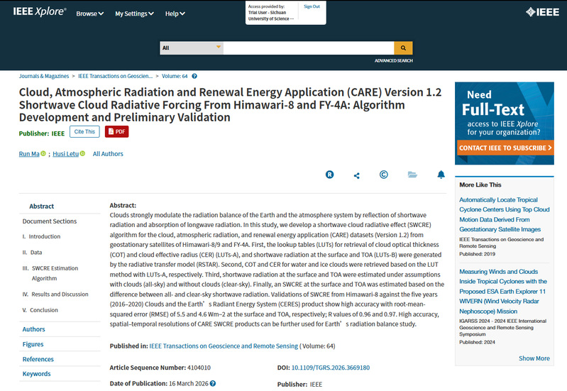 近日,自动化与信息工程学院马润副教授团队在国际地球科学领域旗舰期刊IEEE Transactions on Geoscience and Remote Sensing(TGRS)发表学术论文。我校为论文第一署名单位。该期刊由IEEE主办,是遥感领域公认的国际三大顶级期刊之一,中科院一区TOP期刊,具有重要国际学术影响力。